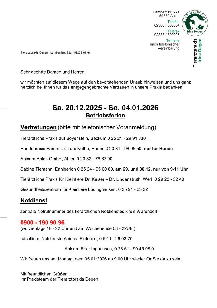 Die ungeraden Kalenderwochen übernimmt die Tierarztpraxis auf Boyenstein/Beckum
